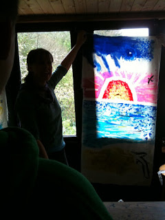 The day was wet so we decided to do fabric printing in The Den. The idea was to make some blinds for the windows.