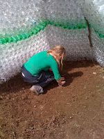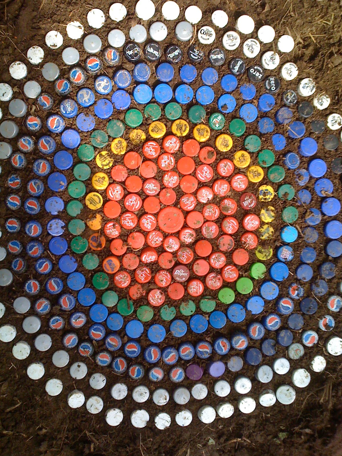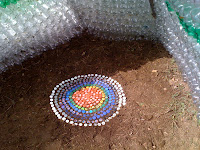 Then we washed and stripped the 1ltr plastic bottles of their wrappers and lids and sorted the lids into colours for the floor.