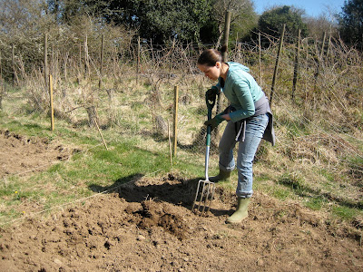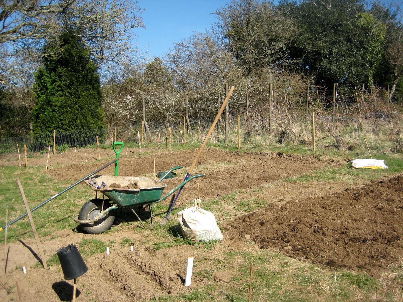 It is a gargantuan struggle – the earth is heavy and dry and the grass is compacted and weedy on top. Cutting the turf off and digging the allotments is exhausting work. But satisfying…….