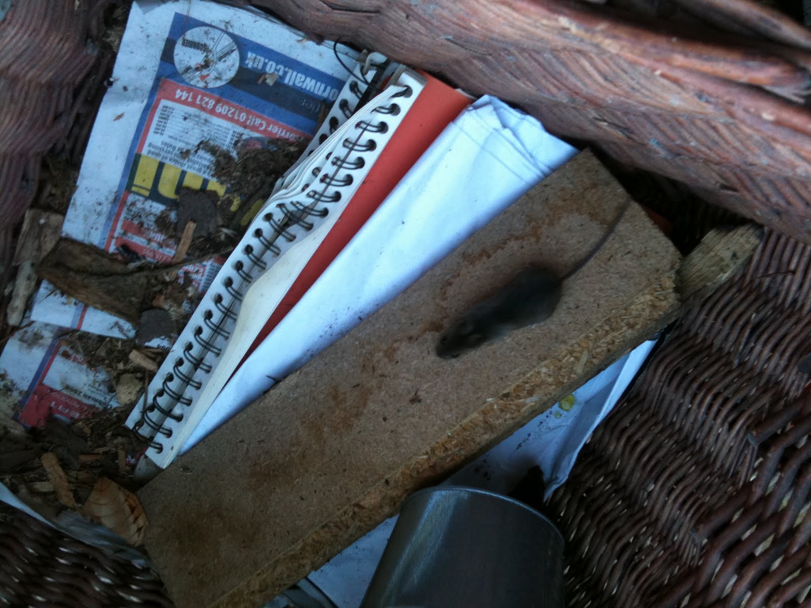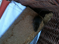 A scrabble around in the near-empty log basket discovered a small family of mice nice and cosy by the woodburner, scuttling about.