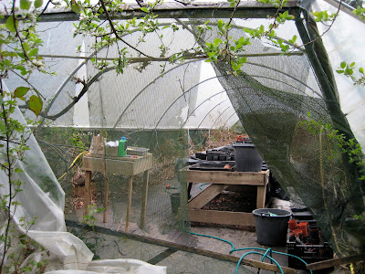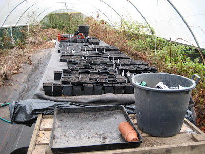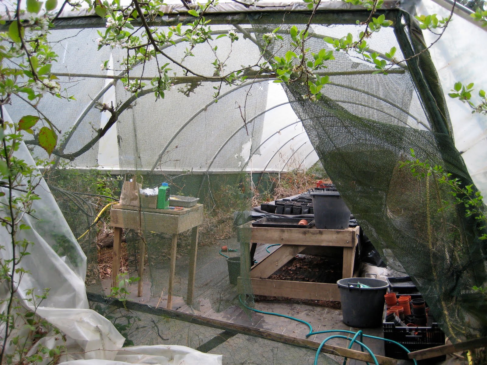 We have pruned back the overgrown vines and swept out the top half of Poly3 ready to make use of the space and tables to create a nursery. As a back up to the outdoor planting, the same seeds have been sown in pots and trays in case of crop failure or bad weather. They will also provide a second crop to plant out in PolyHQ tunnel. French marigolds have also been sown to add to the planting to help prevent white fly and pests. Some cut flower seeds have also been sown to create a flower garden near the entrance gate. Boy! is it hot in here!!!!