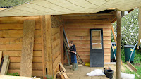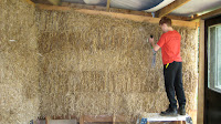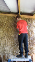The Straw Bales required shaving to get the walls smooth before we could attempt the cob render. This was laborious and time consuming…..some of us tried to cheat and used the strimmer! It was never going to be THAT smooth but the effort made to give the build a close shave was tremendous.