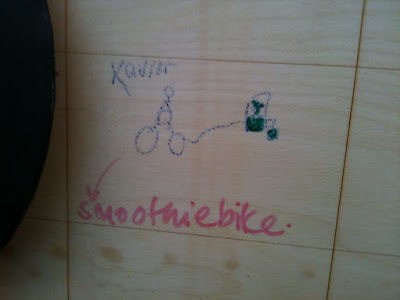 Smoothie Bike Take an energetic boy…… add a bike…… boy cycling hardattached to a dynamo…… A blender attached to the power cable….. Add heaps of yummy exotic fruit …… Pedal and blend….. And WOW! a Fruit Smoothie ……. Fantastic fun and soooo delicious