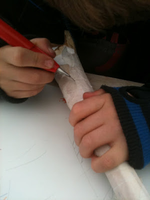 After a forage into the woods to gather branches for whittling and shaping the chair legs we set to carving out our shapes for printing the designs