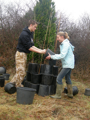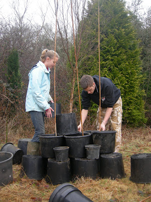Better weather today so we decided to do a lesson in building foundations. The exercise is to create a self supporting structure using only 2 found materials in the garden. Flowerpots and bamboo canes.