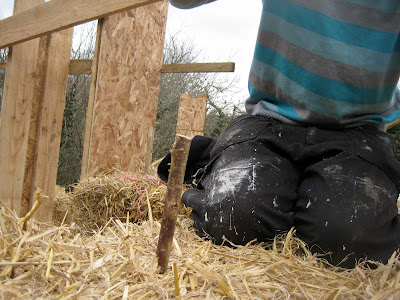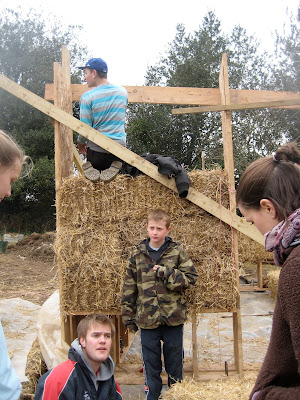 The frame is ready and the straw bales are going in. And there is no rain!!!!