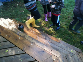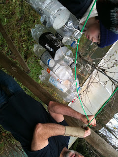 After partial success with the Archimedes Screw, we went outside and tried to make a water=transport system using pulleys, string and recycled bottles