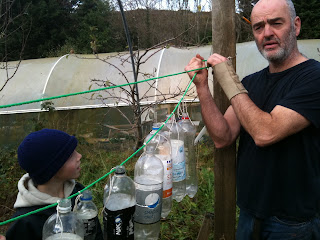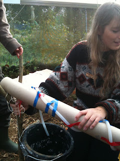 Back inside the polytunnel for a warm up, we get going with taking some of the ideas from ideas board and models we made last week, and have a go at practical ideas for transporting water uphill. We start by trying to make an Archimedes Screw out of pipe and a cardboard tube.