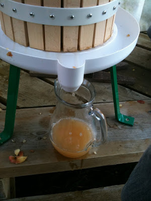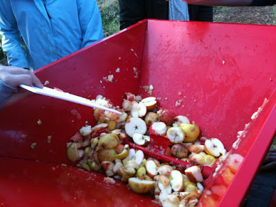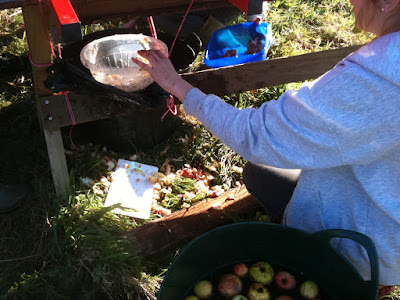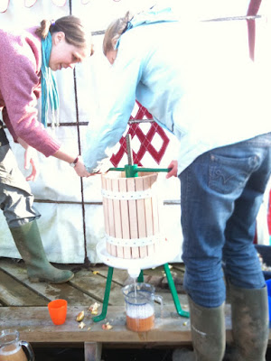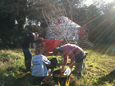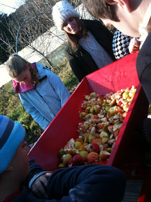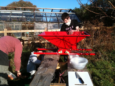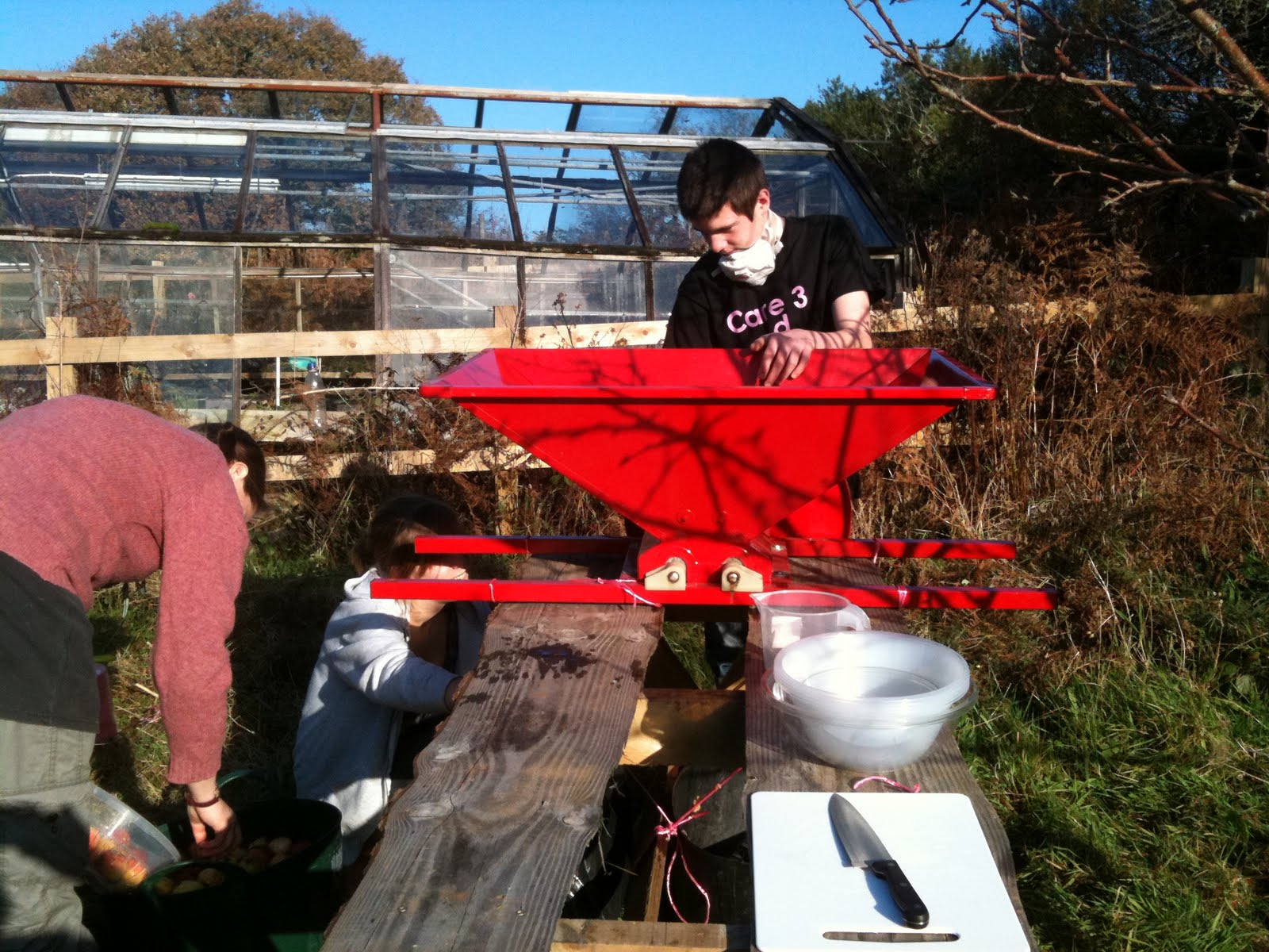 We have borrowed the ‘scratter’ (apple crusher) from the Gardeners at Tremough Campus. We have picked up barrowloads of windfall apples in the orchards and off we go!