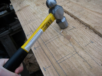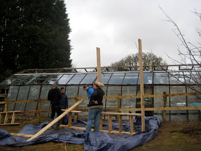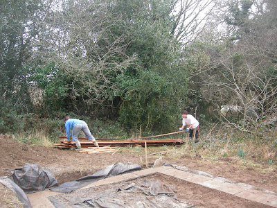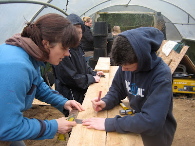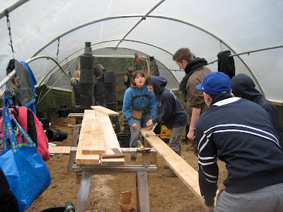 Making the frame for the Straw Bale shelter. After wood working party hauled the delivery up the hill, the wood was stored neatly in the dry polytunnel.